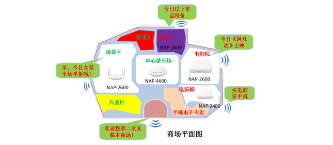 例如:在商场中心游乐场部署AP,提供最新的802.11ac的大带宽接入,让顾客在尽情游玩时,实时上网分享自己的游玩快照。在服装区部署AP双频接入,实现购物人潮的大量接入。在电影院部署AP,天线内置,不影响电影院的美观。