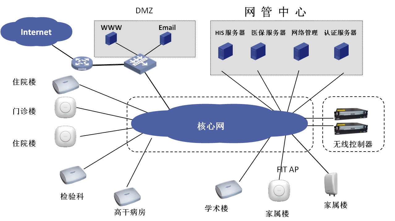 无线医院整个网络架构主要由三部分组成,分别是用户终端层、无线接入层、管理控制层。
